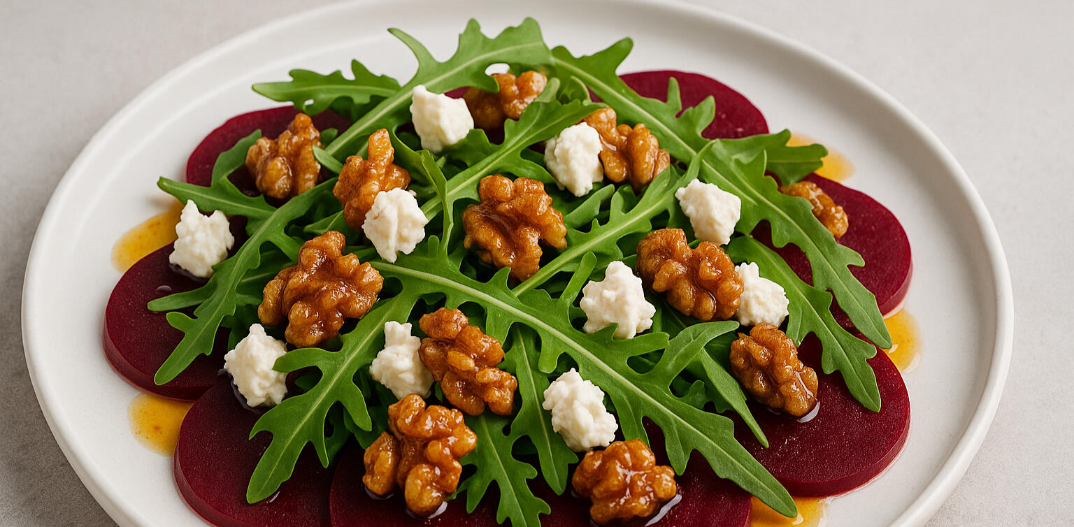 - Rucola, zerbröselten Feta und Walnüsse darauf verteilen.